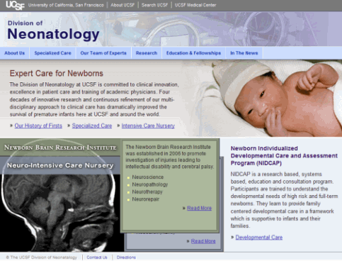 I managed the infrastructure and provided the template for the development of the neonatal website at UCSF. This site provides information about the research and clinical expertise of the division of neonatology at UCSF.